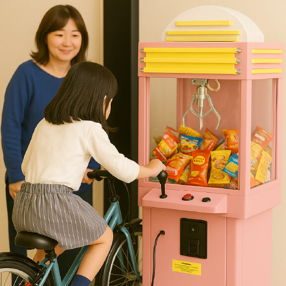 自転車を漕いで発電した電力で、クレーンゲームを動かします。お菓子GETを目指して漕ぎまくろう!!