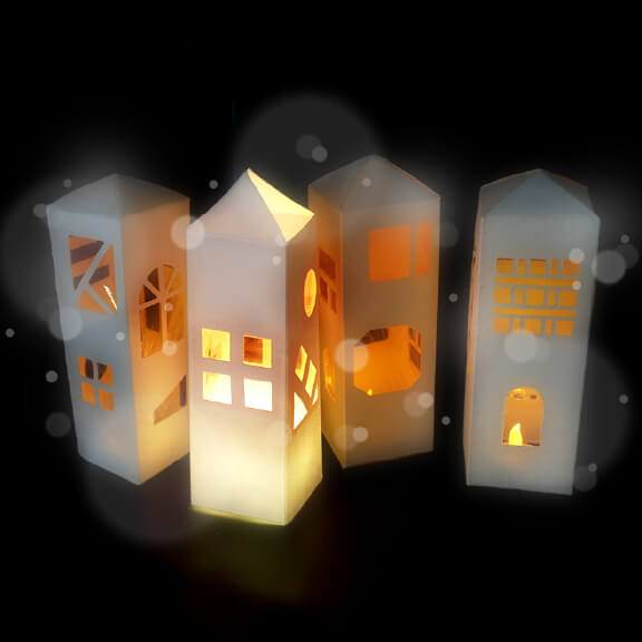 色とりどりのあかりが優しくともる家やビルを牛乳パック型で作り、美しいヒカリのマチを創ります。