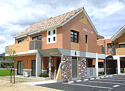 JR新倉敷駅より東へ1.0kの田園風景の残る住宅地に「10戸の集落」をテーマに長く居住でき、住人同士のコミュニケーションのある低層集合住宅として計画している。住戸計画は南北に細長い敷地を利用し、中央の路地を軸に左右全戸南向きの3LDK〜2DKまでのファミリータイプ住戸を配置。1階は専用庭兼用の駐車場(2台)を設け、中央階段部にコミュニティースペース(砂場、ベンチ)を設け住人(奥さん、子供)の憩いの場としている。(将来南道路側に住人の家庭菜園を設ける予定)住環境<日照、通風、遮音、省エネルギー>は計画当初より断熱性の良い粘土瓦を7.5寸の急勾配屋根とし、環境外観デザインを構成、外部建具はペアガラス、又内部は自然素材(珪藻土、シナ合板等)を最大限利用しビニールクロス等は一切使用していない。設備機器はオール電化とし、電気温水器(自動タイプ)、3口IH電気調理器、エアコン(マルチ2室空調)、電気錠、テレビカメラ付インターホンを設置し将来の住環境変化に対応できる集合住宅を目指した。外観も「10戸の集落」をデザインコンセプトに、S瓦、石、レンガ、色彩等で北欧風の建物をイメージし、場所により表情を変化させ住人の心を和ませている。