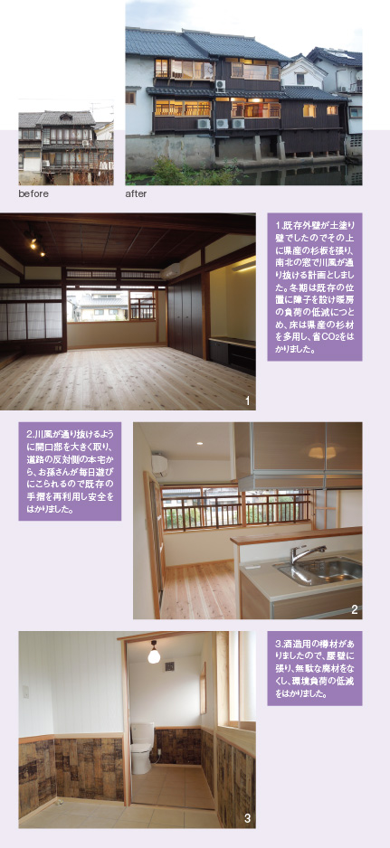 今回の改修では主要部は、100年後まで使用可能なように、屋根の葺き替えから構造補強、バリアフリー化を含め、また将来の入居形態の変更も考慮に入れて設計しました。工事予算が少ないこともあり、間取り、外壁、天井、内法り材はできるだけそのまま使用し、撤去した廃材の棚板、敷居鴨居等また酒造用の樽材がありましたので再利用を行い、環境負荷の低減をはかりました。既存外壁が土塗り壁でしたので、その上に県産の杉板を張り、南北に窓を設け川風が通り抜けるようにし、自然エネルギーの有効利用をはかりました。エコキュート、IHクッキングヒーター、節水型トイレ、LED照明、省エネ性に優れた高効率のエアコンを採用して省エネを図り、床材に県産杉材を多用することで省CO2に努めました。