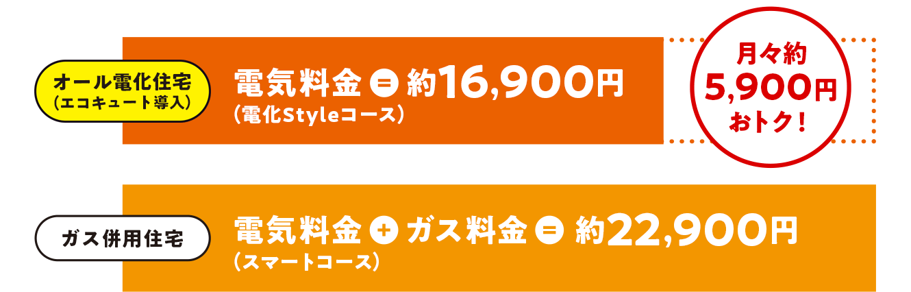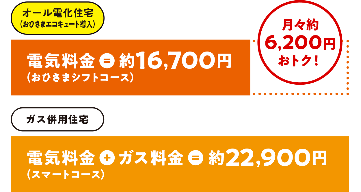 給湯と調理に都市ガスをご利用のガス併用住宅と、エコキュートを導入したオール電化住宅のひと月当たりの光熱費を比べてみると