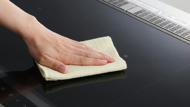 平らなプレートだから、サッと拭くだけでキレイに。お掃除がとってもラクちんです。重い鍋もスライドさせるだけで動かせます。