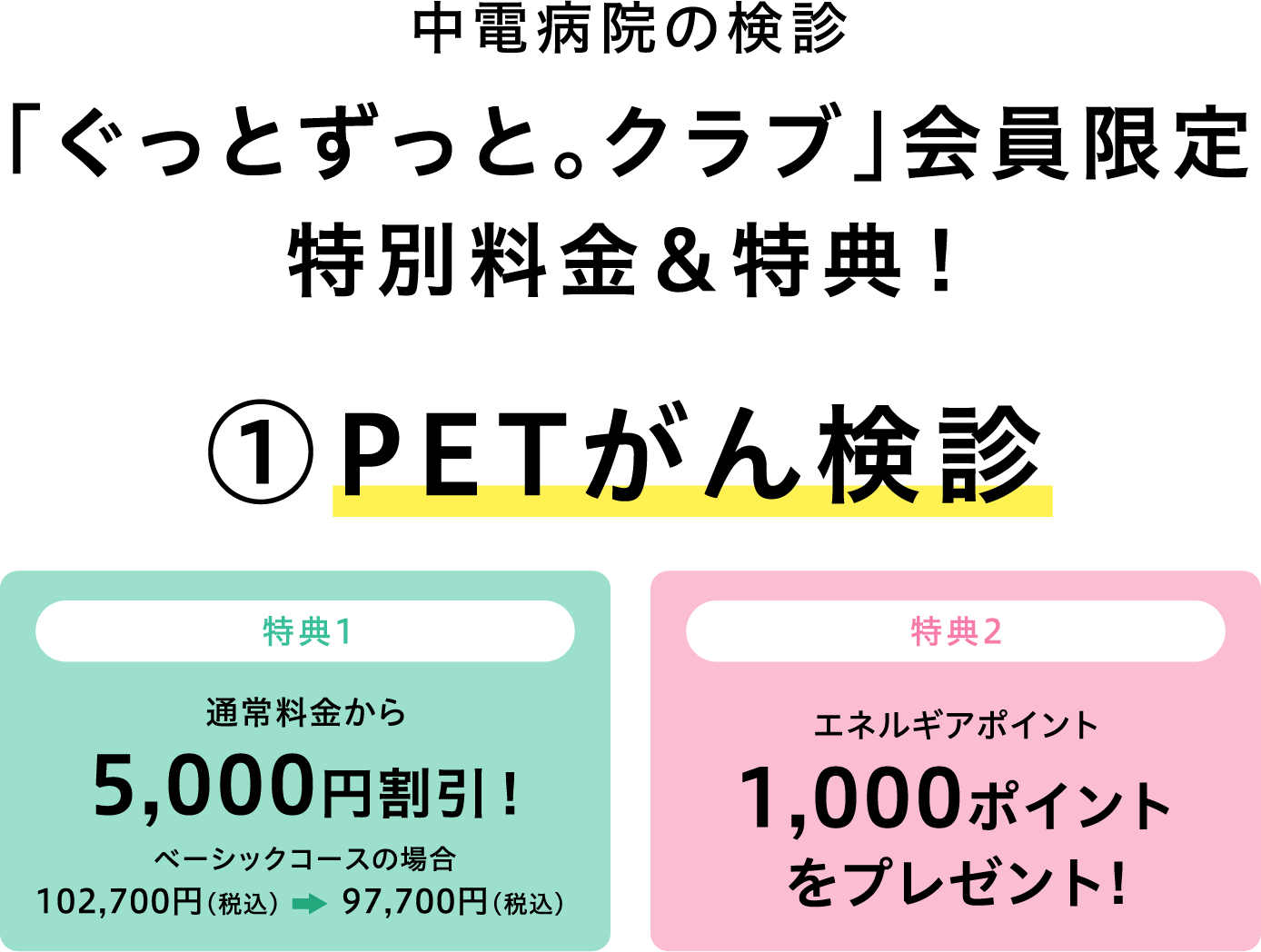 - 中電病院では、PETがん検診について、ぐっとずっと。クラブ会員以外の方向けの割引も別途ご用意しています。詳しくはこちら(中電病院HPへリンクします)