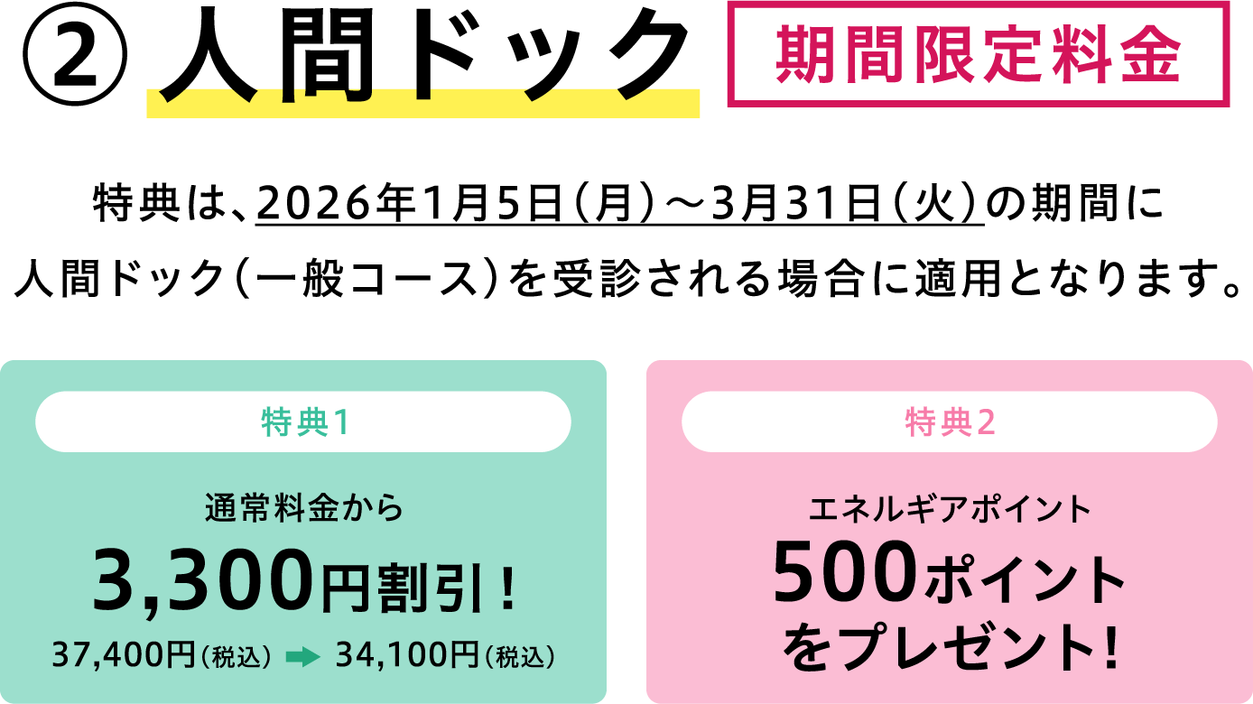 - 中電病院では、上記の期間、人間ドック(一般コース)について、ぐっとずっと。クラブ会員以外の方向けの割引も別途ご用意しています。詳しくはこちら(中電病院HPへリンクします)