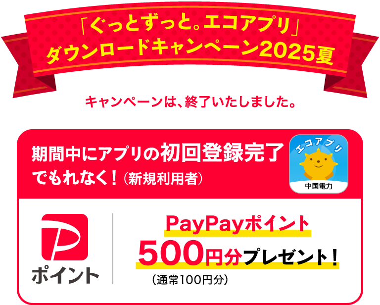 - 既に「ぐっとずっと。エコアプリ」(旧名称:ぐっとずっと。節電チャレンジ中国電力)の利用登録が完了済みの方はご登録不要です。