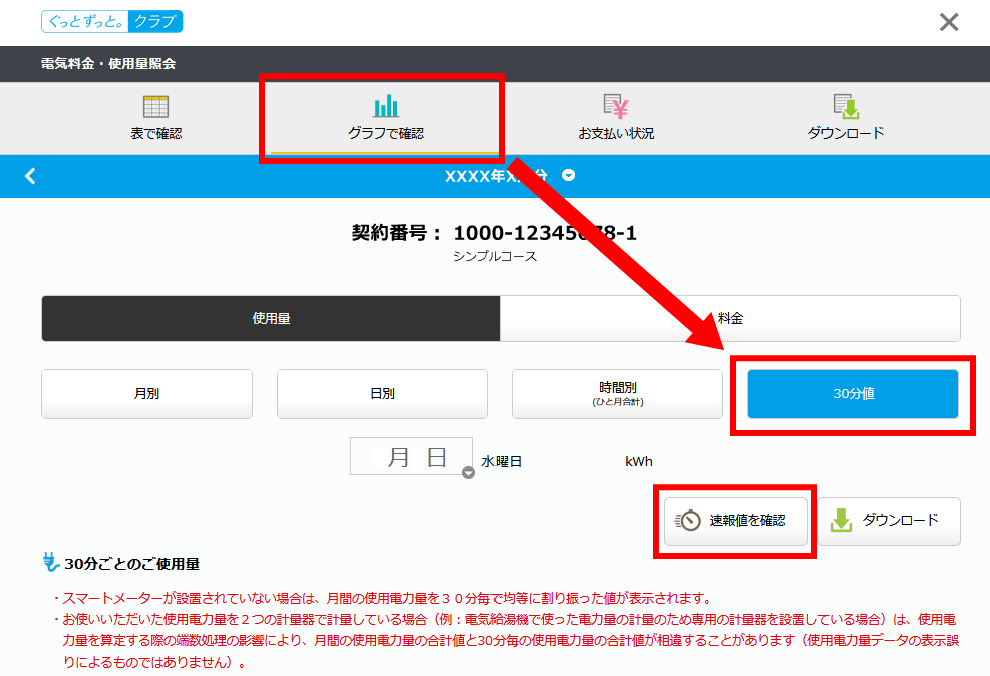 ぐっとずっと。クラブにログイン後、ご利用状況の「電気料金・使用量照会」画面から「グラフで確認」ボタンー「30分値」ボタンを押下し、「速報値を確認」ボタンが表示されていれば、スマートメーターが設置されています。