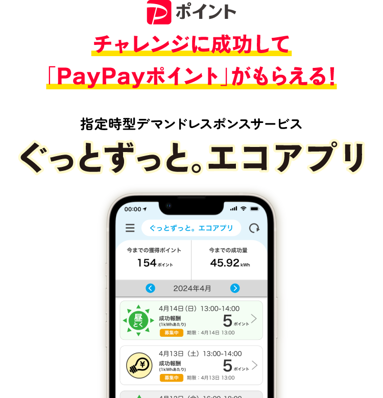 節電チャレンジ・昼とくチャレンジに参加して電気の使い方を変化させ、チャレンジに成功するとPayPayポイントがもらえるアプリです。