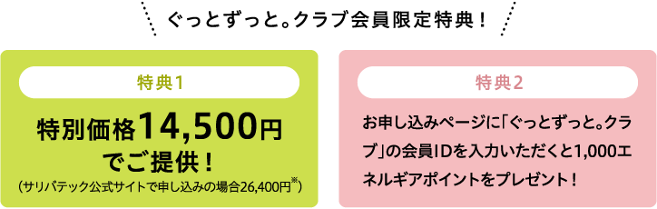 第一弾!がんのリスクを手軽に検査できる「だ液のがんリスク検査」 がんの種類ごとに現在のがんリスクを一度に検査できます。 サリバテック公式サイトでお申し込みの場合には、医療機関を介して検査結果が通知されますが、「ぐっとずっと。クラブ」を経由してお申し込みの場合には、医療機関を介さずに検査結果が通知されます。 第二弾!中電病院のPETがん検診 「ぐっとずっと。クラブ」会員限定割引&特典!