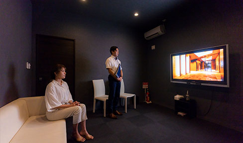 今回訪問したのは、横川駅から徒歩約8分の場所にあるモデルルーム。完全予約制のうえ、駐車場も用意されているので小さなお子様連れでも気軽に見学できます。1階は相談スペースとシアタールーム、2階はモデルルームなっていました。シアタールームでは周辺環境やマンションのポイントをまとめたコンセプトムービーを鑑賞。映像で見ると詳細が分かりやすくてより理解できます。