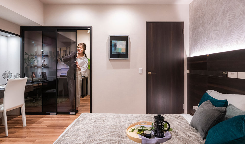 続いてプライベートルームを見ていきます。今回のモデルルームにはオプションで2つの個室をひとつなぎにしたお部屋(上の写真)がありました。ベッドルームと書斎がスモークガラスで区切られた、まさにイマドキの間取り。最近はリモートワークが増えているから書斎はマストになりつつある中でこういった仕様変更はとても参考になります。書斎は仕事部屋になり、趣味ルームになり。家族のライフスタイルに合わせて可変できるのは高ポイントです。また、角住戸のAタイプの場合は、キッチン、キッズルーム、ベッドルームがバルコニーで繋がっています。どこにいても家族の気配を感じられ、居心地の良いプライベートルームになっていました。