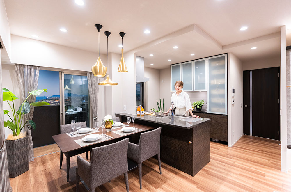 今回のマンションは、1フロア3邸、販売戸数39戸中26戸が角住戸という通風・採光性に優れたマンションです。間取りは2LDK+Sから4LDKまでのファミリー向けプランを中心に用意されていました。モデルルームは、4LDKの一部を仕様変更したもの。まずは、住まいの中心となるLDKからご案内いただきました。LDKは死角のない長方形型で、どの位置にいても家族の顔を見ながら過ごせるオープンな空間。オプションのダウンライトはLDKのスタイリッシュさと開放感を高めるとともに、統一感のある雰囲気を演出しています。