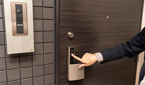 エントランスホールもシックな装い。メインエントランスについては、標準装備の「ハンズフリーTebraキー」を携帯しておくと、リーダーの正面に立つだけで自動認証・解錠されます(最大2m)。約3m以内であれば、リモコン操作にも対応しています。