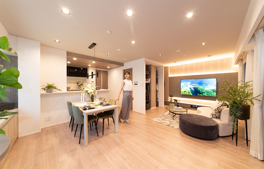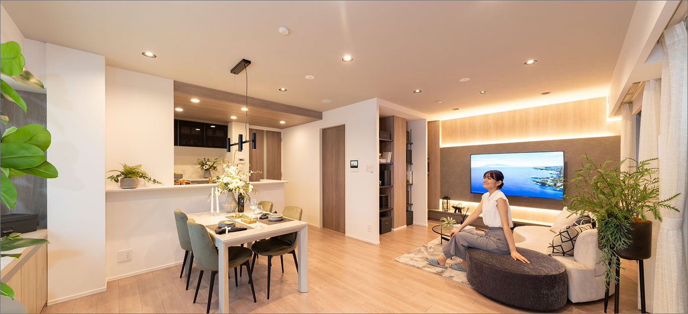 今回見学したのはAタイプのお部屋。通常は3LDKですが、モデルルームでは洋室1部屋との間仕切りを取り、リビング・ダイニング・キッチンを合わせて約21.2帖に拡張した2LDKにアレンジされていました。もともと洋室だった部分には、クローゼットの空間を生かしてオプションの飾り棚を設置。壁一面はテレビが掛けられるようカスタマイズされています。窓際の天井部分には、標準装備のカーテンボックスが。生活感を隠し、広々とした空間をさらに洗練された印象にしてくれます。
