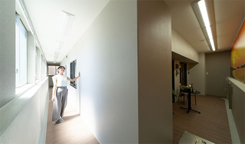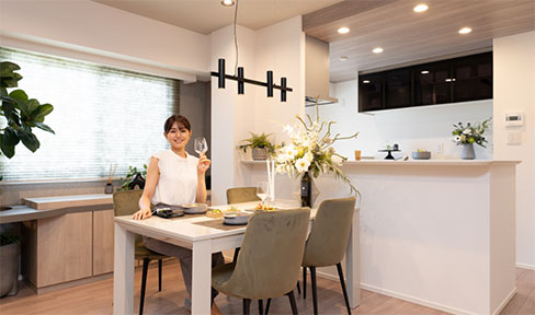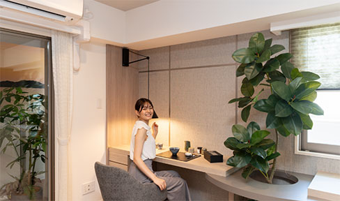 キッチンの前にはダイニングスペースがあり、その奥にはオプションのカウンターが作りつけられています。仕事をする場所としてはもちろん、趣味を集中して楽しむ場所にもぴったり!観葉植物がのぞく、円形のカッティングもおしゃれです。モデルルームで行われているカスタマイズは、どれも実際に対応可能なものばかり。「こんな風にしてみたい」というリクエストがあれば、相談にも乗ってもらえるそうです。また、このマンションではリビングダイニングのスペースに、柱が飛び出さないつくりになっています。すっきりとした空間だからこそ隅々まで活用することができ、家具の置き方やカスタマイズの幅も広がりますね。
