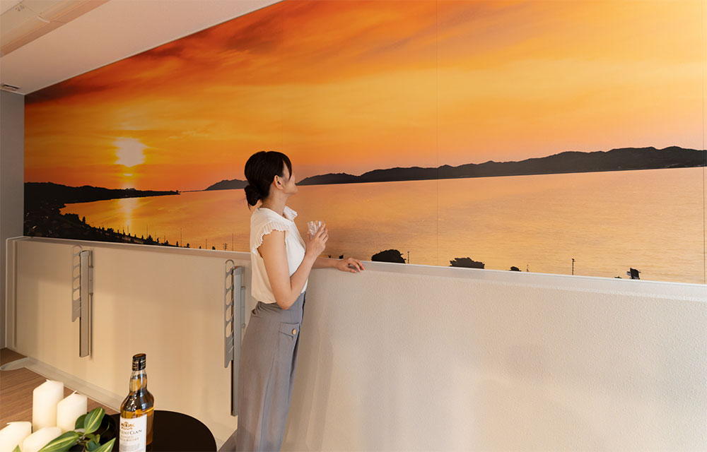 モデルルームを見学する前に、商談スペースでマンション全体についての説明を聞きます。モニターに次々と現れる画像のなかでまず目に留まったのは、花火の写真!全邸のバルコニーが宍道湖に向いているこのマンションでは、日本有数の花火大会である「松江水郷祭」の花火をプライベートな空間で楽しむことができます。また、水回りや鍵のトラブル、照明器具の交換などに対応してもらえる「ハッピーサポートサービス※」や、アフターメンテナンスなどを気軽に相談できるコールセンターなど、24時間365日対応のサービスも充実しています。アクセスや住環境の良さ、快適な住空間にこだわっており、安らぎと安心感に満ちた暮らしを送ることができます。