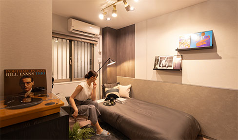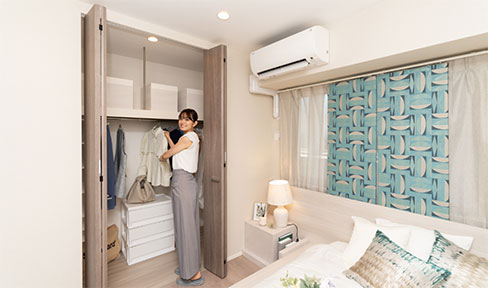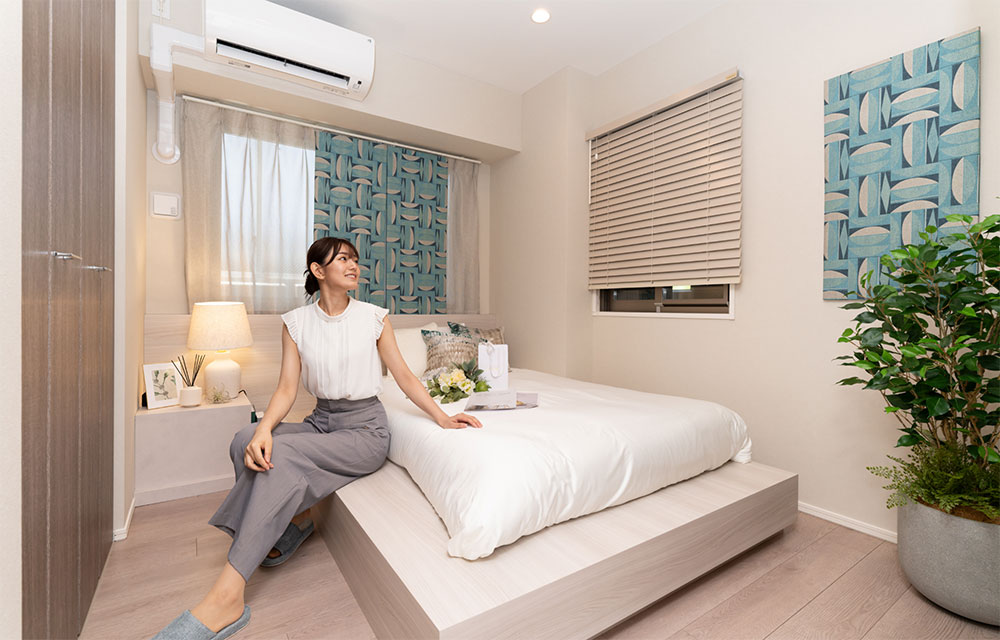Aタイプの洋室はすべて約5帖。寝室や子ども部屋、趣味の部屋など、生活のスタイルに応じてさまざまな使い方ができる広さです。こちらの洋室では、オプションでベッド台とサイドテーブル、ブックシェルフを作り付けています。内装との統一感があり、お部屋を爽やかな印象にまとめてくれています。