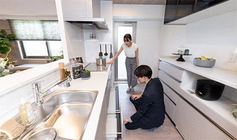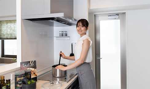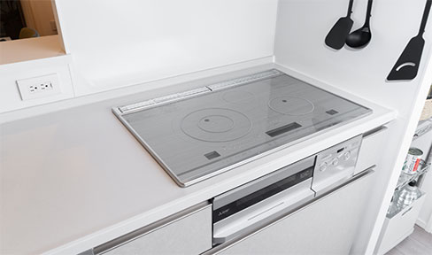 オール電化のこのマンションでは、全戸にIHクッキングヒーターを採用しています。IHクッキングヒーターは、鍋そのものを発熱させて調理するため、熱効率が高く、パワフルな加熱なので、湯沸かしもあっという間。火力が必要なステーキや炒め物なども美味しく作れます。また、トッププレートがフラットなため、汚れてもサッと拭きやすくお手入れがラクであるというメリットもあります。最長で10年間のリース契約※を採用しているので、その間の修理や補償が手厚いのも嬉しいポイントです。