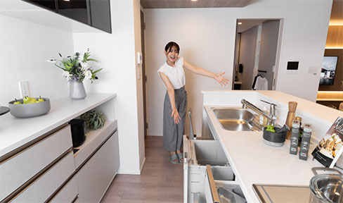 キッチンのスペースは約4.3帖。調理台の幅は約2.4mあり、シンクも作業スペースも十分な大きさです。モデルルームではオプションのカップボードが設置されていましたが、それでも広々!家族と一緒にキッチンに立ってもすれ違うことができる、ゆとりのあるつくりが人気です。