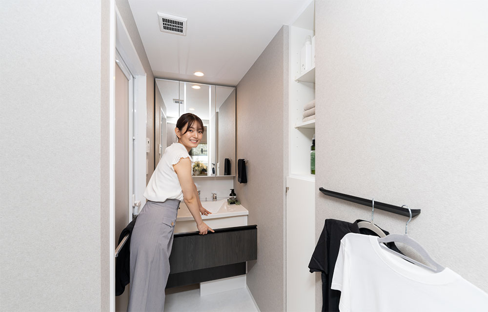 ホワイトとブラックが基調のパウダールーム。モデルルームでは、オプションで選べるツインライン照明の洗面台が採用されていました。タオルなどを収納する棚はコンパクトでシンプルなつくりですが、水栓下が大容量の収納に。引き出しの色は好みのものを選ぶことができます。