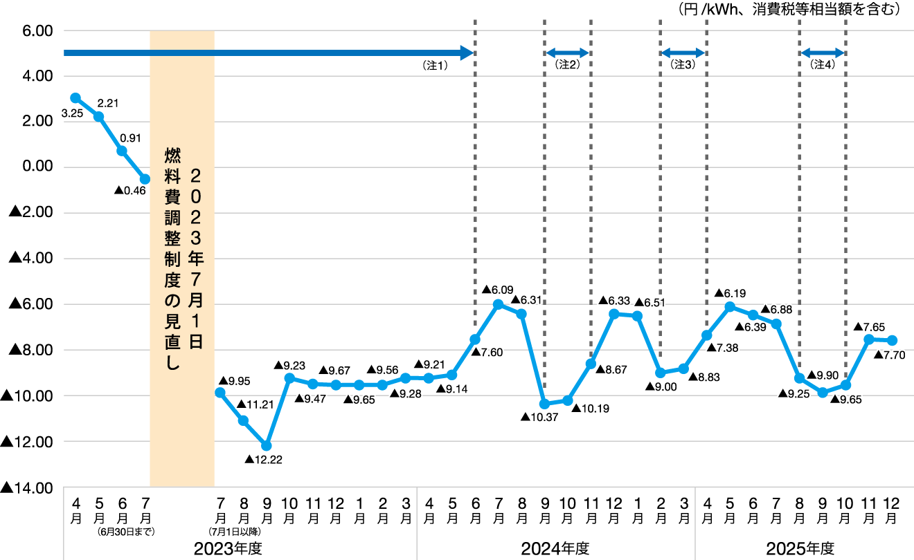 - (注4)2025年8月~10月分は 、政府が実施する「電気・ガス料金支援」による特別措置(2025年8月分:▲2.00円/kWh、2025年9月分:▲2.40円/kWh、2025年10月分:▲2.00円/kWh)反映後の燃料費調整単価を示しています。